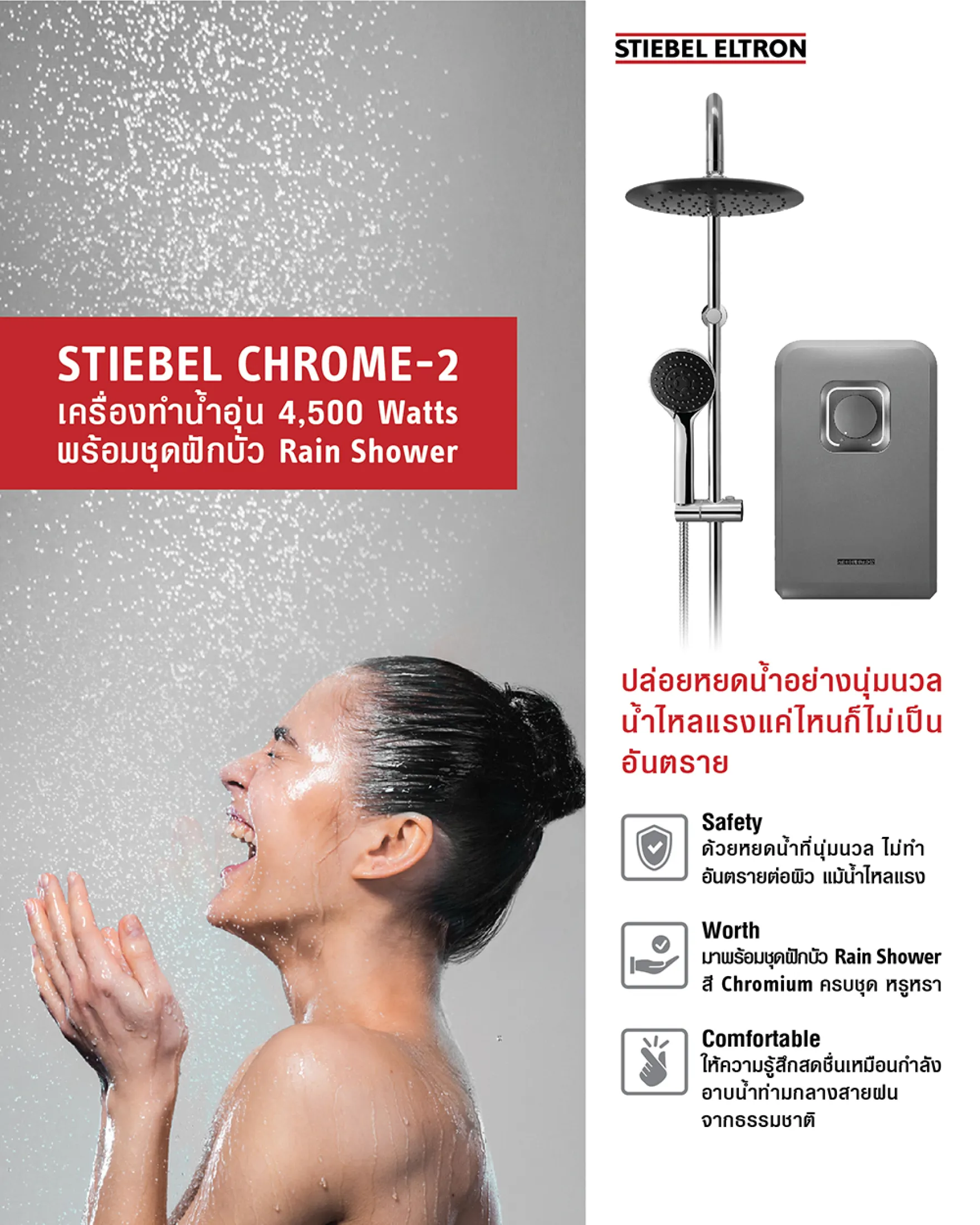 Stiebel Eltron เครื่องทำน้ำอุ่น รุ่น STIEBEL CHROME-2มี ELSB ระบบตัดกระแสไฟฟ้าอัตโนมัติ เมื่อมีกระแสไฟฟ้ารั่ว